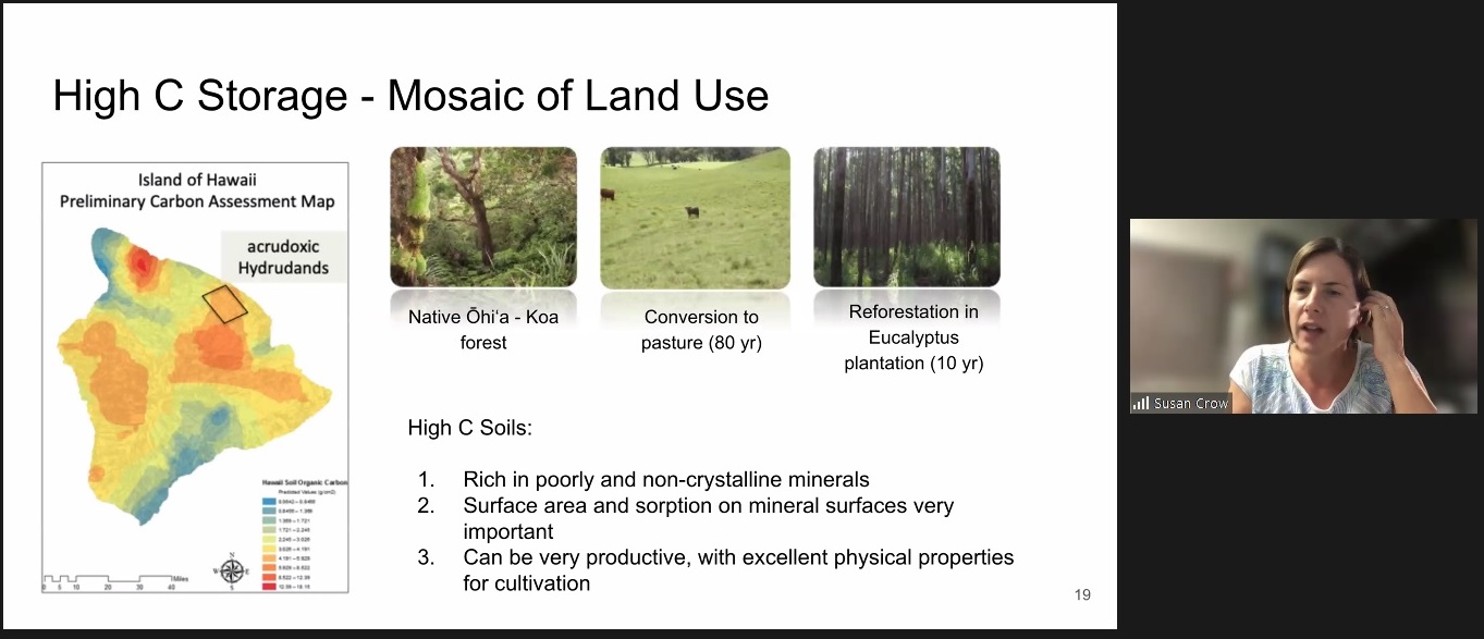 Por su parte, la Dra. Crow mostró algunas de las investigaciones que están desarrollando en diferentes áreas de las islas de Hawai en suelos derivados de ceniza volcánica, específicamente, en la Costa de Hamakua.