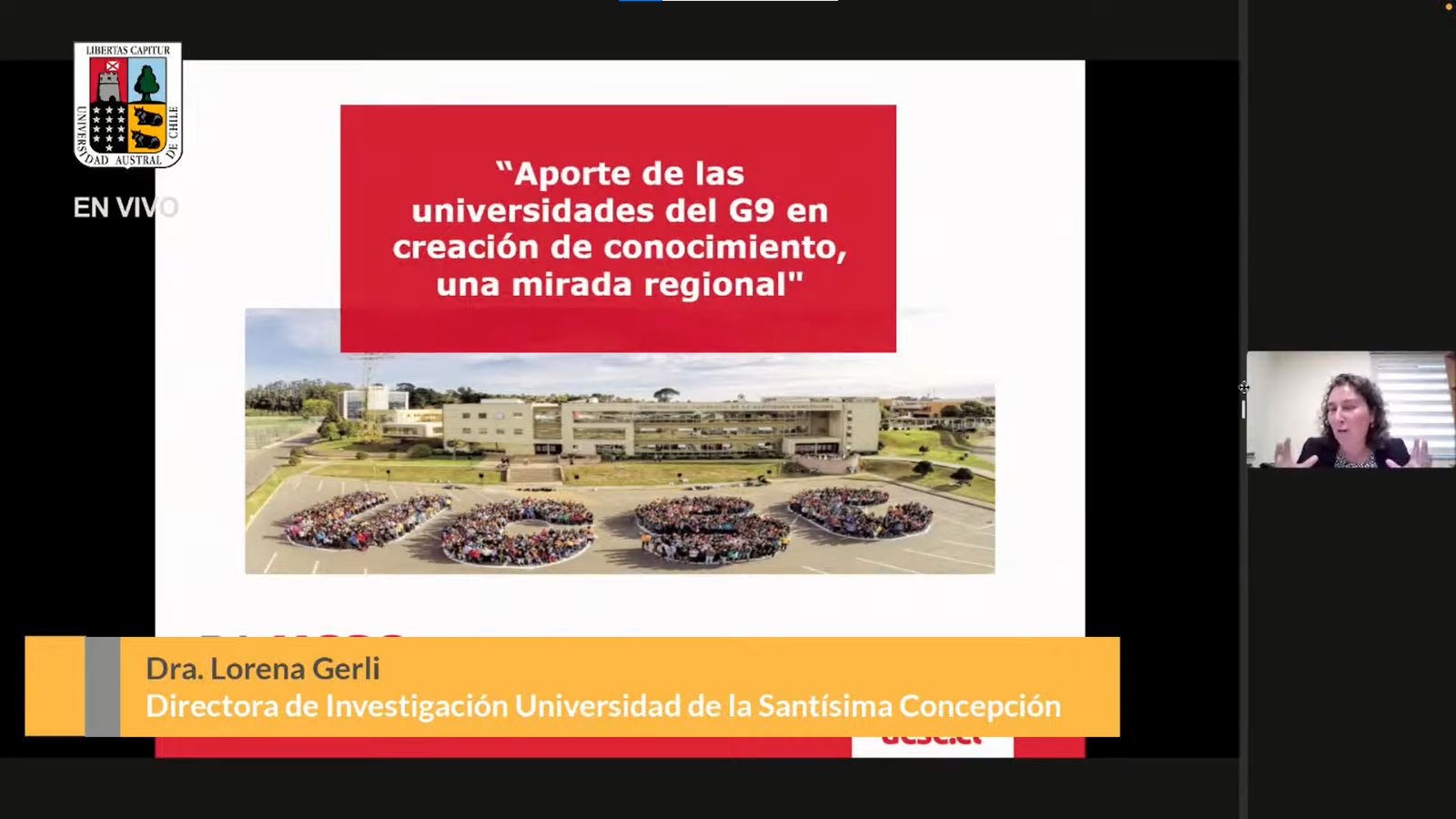 Para finalizar las ponencias, la Dra. Lorena Gerli, Directora de Investigación de la U. Católica de la Santísima Concepción, dio cuenta del panorama nacional en producción de conocimiento, destacando algunos indicadores de las instituciones del G9. Entre algunos de los desafíos identificados, mencionó el trabajo colaborativo, la internacionalización y la igualdad de género.
