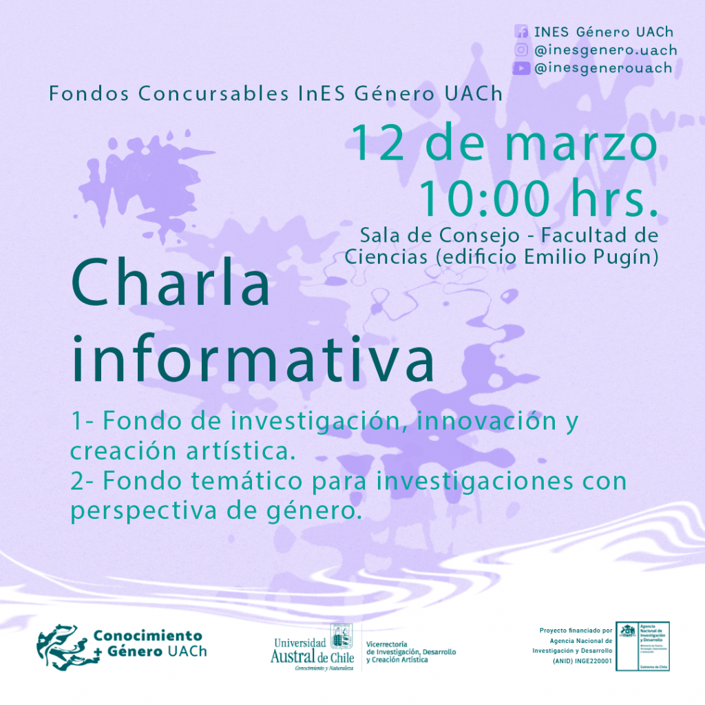 El Proyecto InES Género UACh y la Vicerrectoría de Investigación, Desarrollo y Creación Artística, invitan la comunidad universitaria a la Charla informativa de los Fondos InES Género UACh que se encuentran en periodo de postulación hasta el 5 de abril 2024. La actividad se realizará el martes 12 de marzo a las 10:00 horas en la Sala de Consejo de la Facultad de Ciencias (4° piso edificio Emilio Pugín)