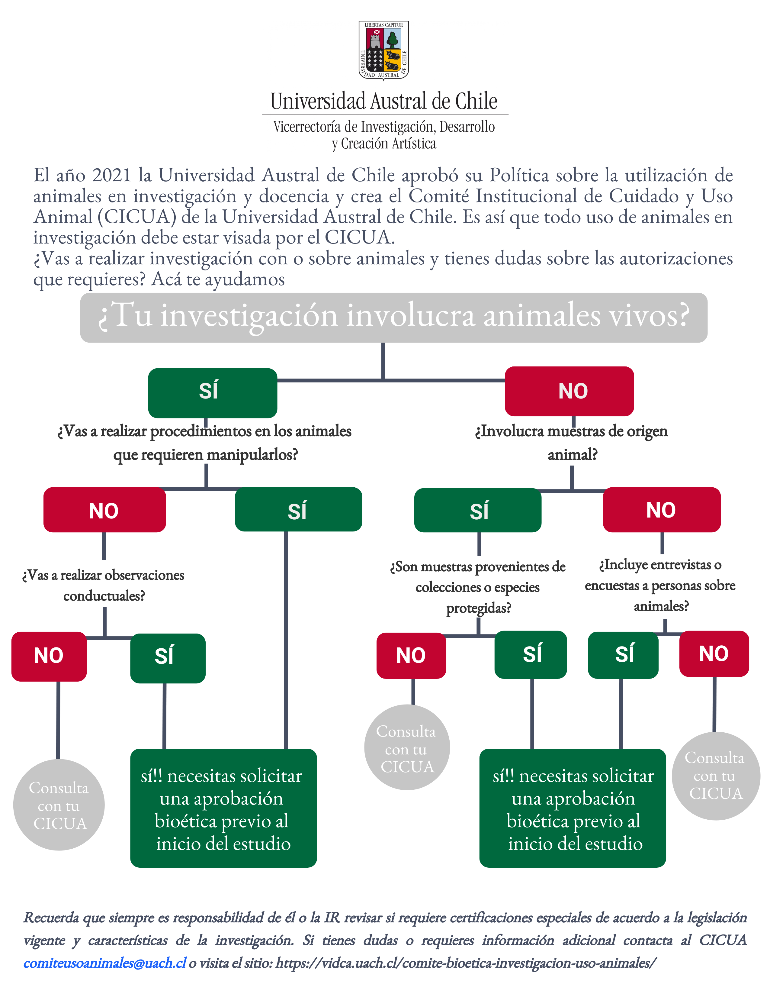 Alcances y ámbitos de acción. El Comité Institucional de Cuidado y Uso de Animales (CICUA) evaluará todos los proyectos que utilicen animales en cualquier etapa de la investigación y en actividades de docencia. En esta revisión y evaluación se incluye: proyectos de investigación, actividades de docencia, proyectos de Vinculación con el medio, trabajos de título o grado y proyectos pilotos debidamente justificados, que se realicen dentro de las dependencias de Universidad Austral de Chile, como en terreno. Aquellos proyectos cuyos procedimientos se realicen en otra institución, no serán evaluados por el CICUA UACh, por lo que él o la investigador/a responsable (IR) deberá solicitar la certificación al comité institucional correspondiente.