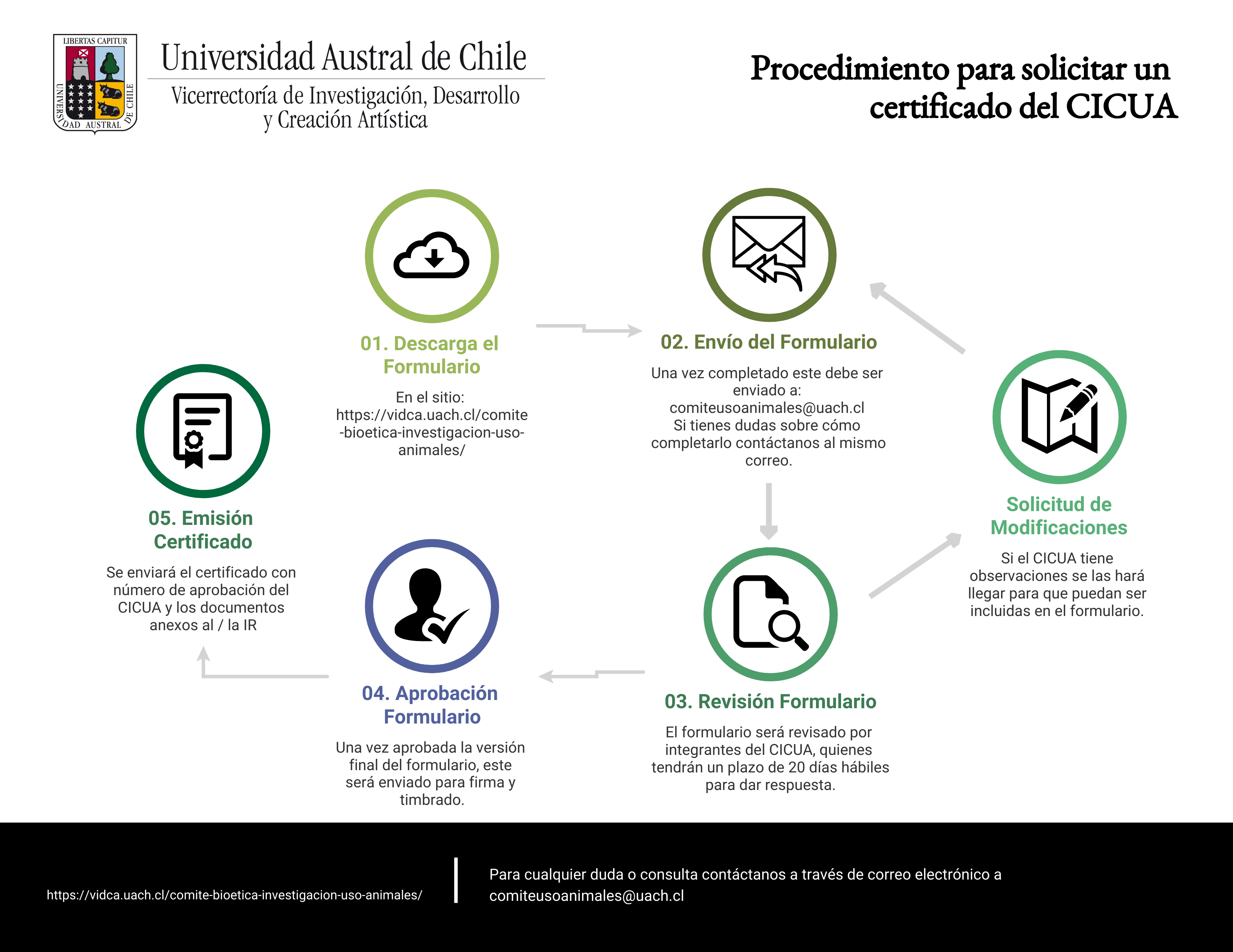 Presentación de proyectos ante el comité. La solicitud de informe se tramita a través de la Vicerrectoría de Investigación, Desarrollo y Creación Artística (VIDCA), enviando los documentos solicitados al email de contacto comiteusoanimales@uach.cl