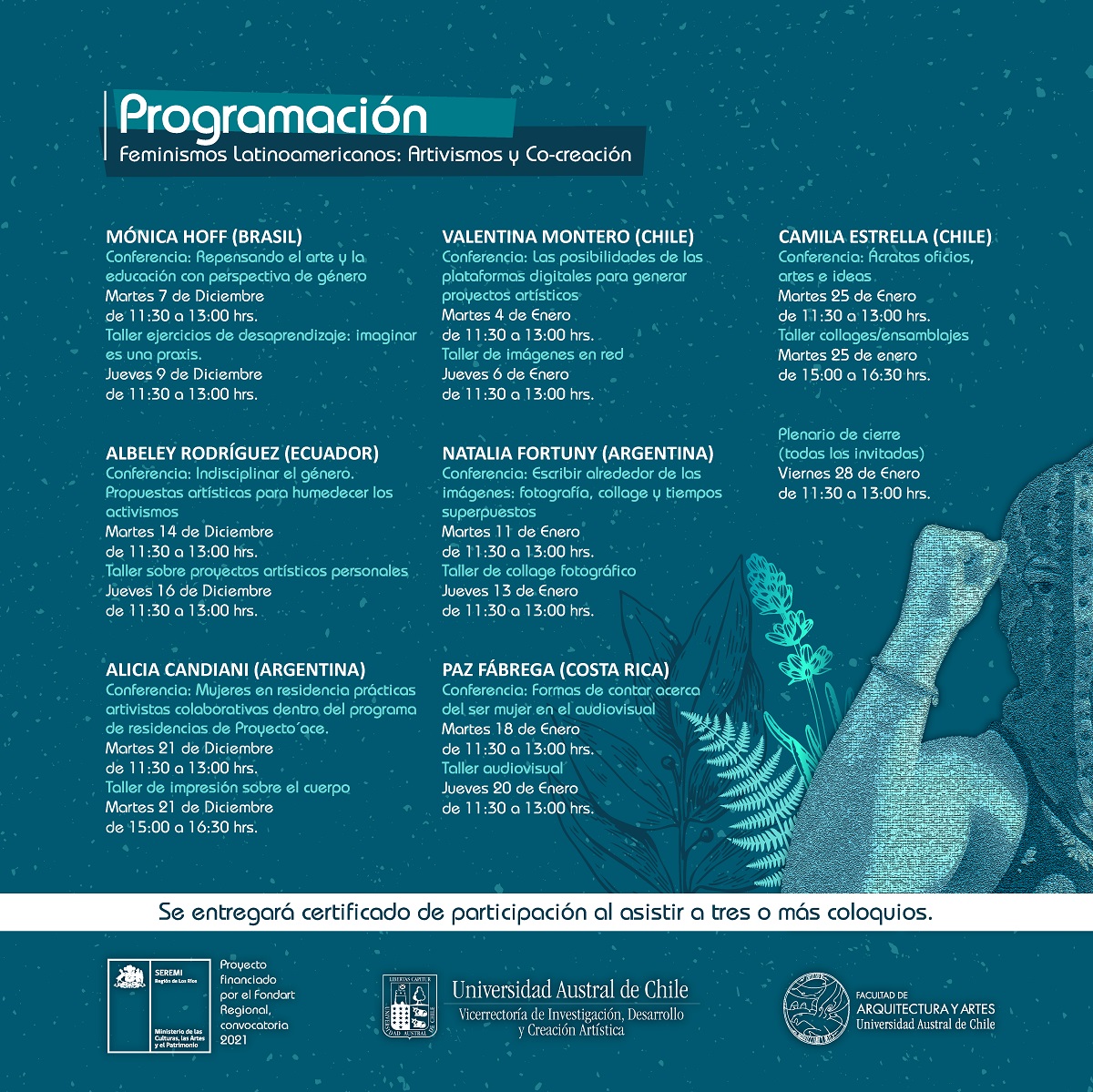 Gran expectación ha generado el ciclo del coloquio “Feminismos Latinoamericanos: artivismos y co-creación”, el cual se desarrolla en el marco del proyecto “Espacios de formación colectiva para potenciar el liderazgo de mujeres artistas y creadoras latinoamericanas” liderado por la Universidad Austral de Chile y adjudicado al FONDART Regional de Los Ríos del Ministerio de las Culturas, las Artes y el Patrimonio.