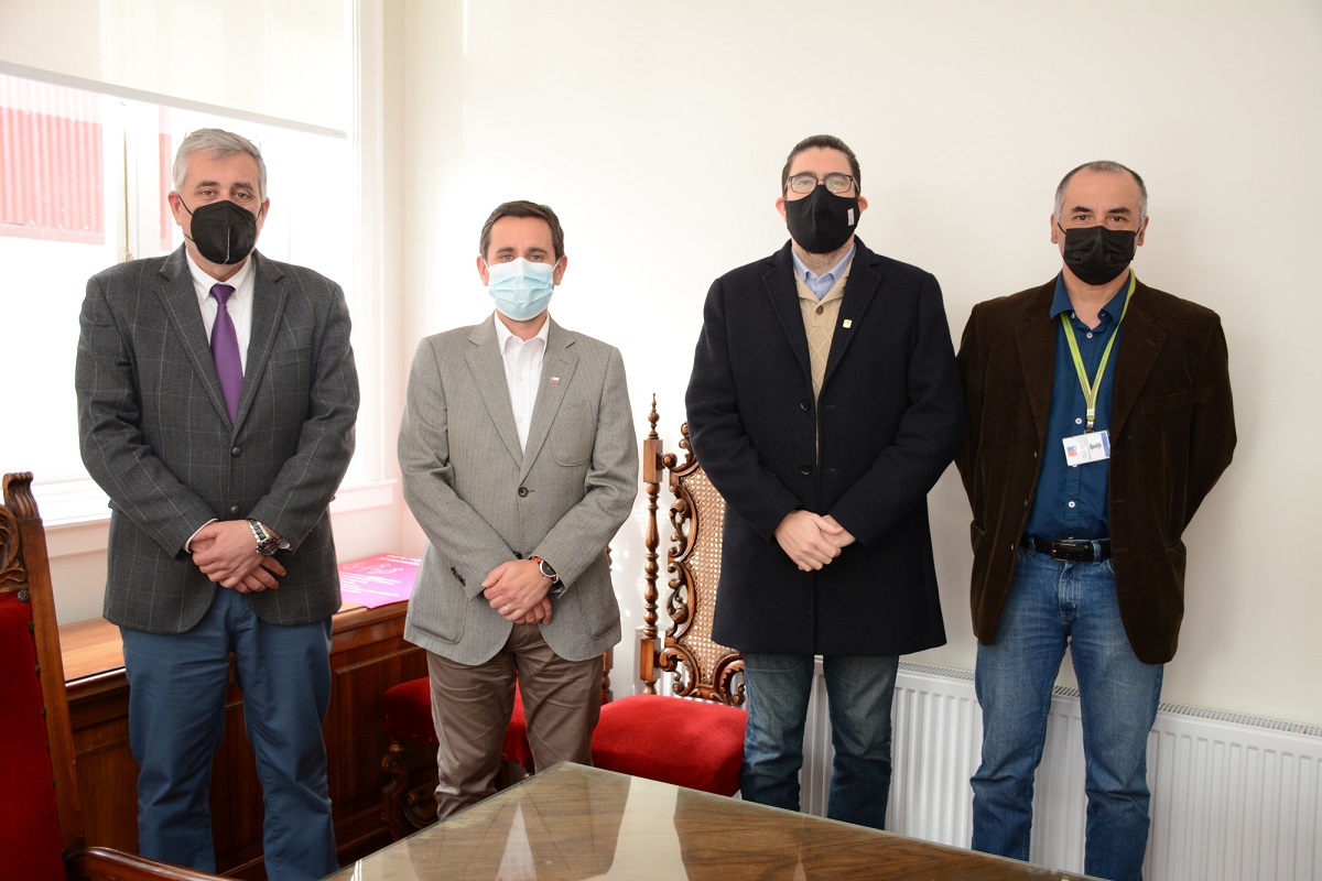 La autoridad universitaria, acompañado por el Vicerrector de Investigación, Desarrollo y Creación Artística, Dr. Mylthon Jiménez, y el investigador y académico de la Facultad de Ciencias UACh, Dr. Roberto Néspolo, se reunió con el Director Regional del SAG, Jorge Oltra y la encargada de Recursos Naturales del SAG, Paula Mujica.