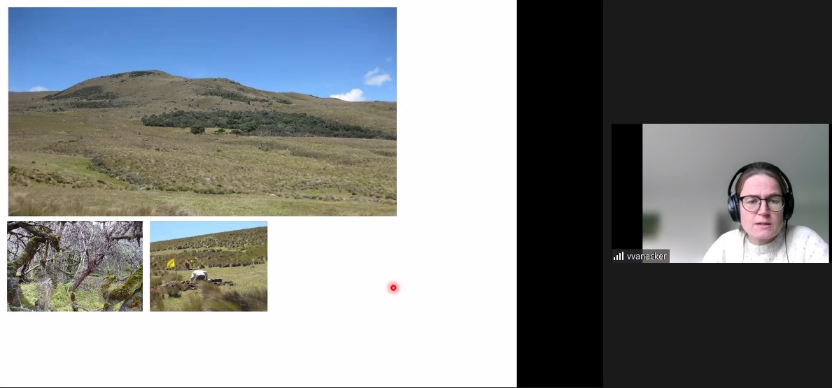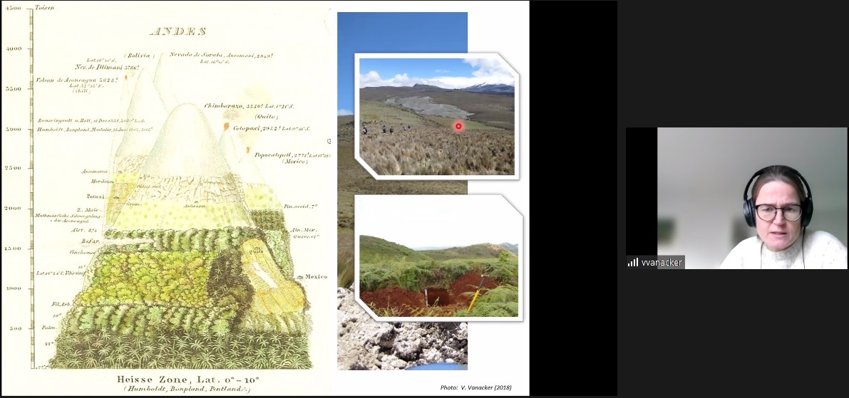 En su presentación la académica comentó el desarrollo del paisaje y los suelos en las zonas montañosas de los andes tropicales. “Estos son unos de los paisajes más espectaculares, tenemos una gran diversidad de especies y distintas comunidades humanas que viven de los servicios que entregan estos ecosistemas. En esta zona tenemos los páramos o de tundra alpina, que se ubican entre la franja continua de los bosques y la nieve perpetua. El clima es frío y húmedo el mayor tiempo del año y existen heladas durante la noche. Tiene mucha radiación solar y precipitaciones de formato distintos”.