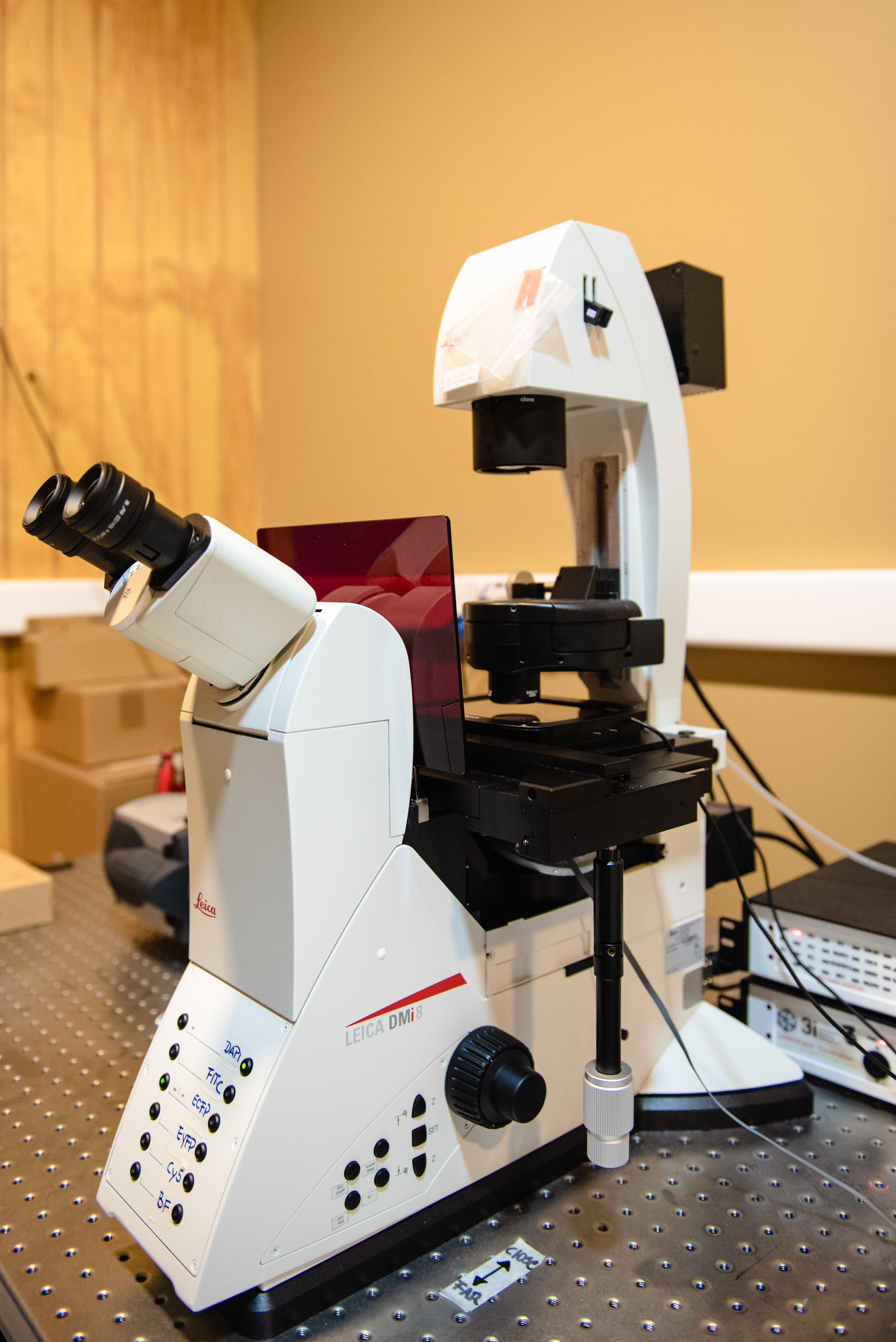 Prestaciones ofrecidas: Microscopio invertido DMi8 (Leica Biosystems). Eje Z, cubos de epi-fluorescencia y condensador motorizado. Platina XY manual