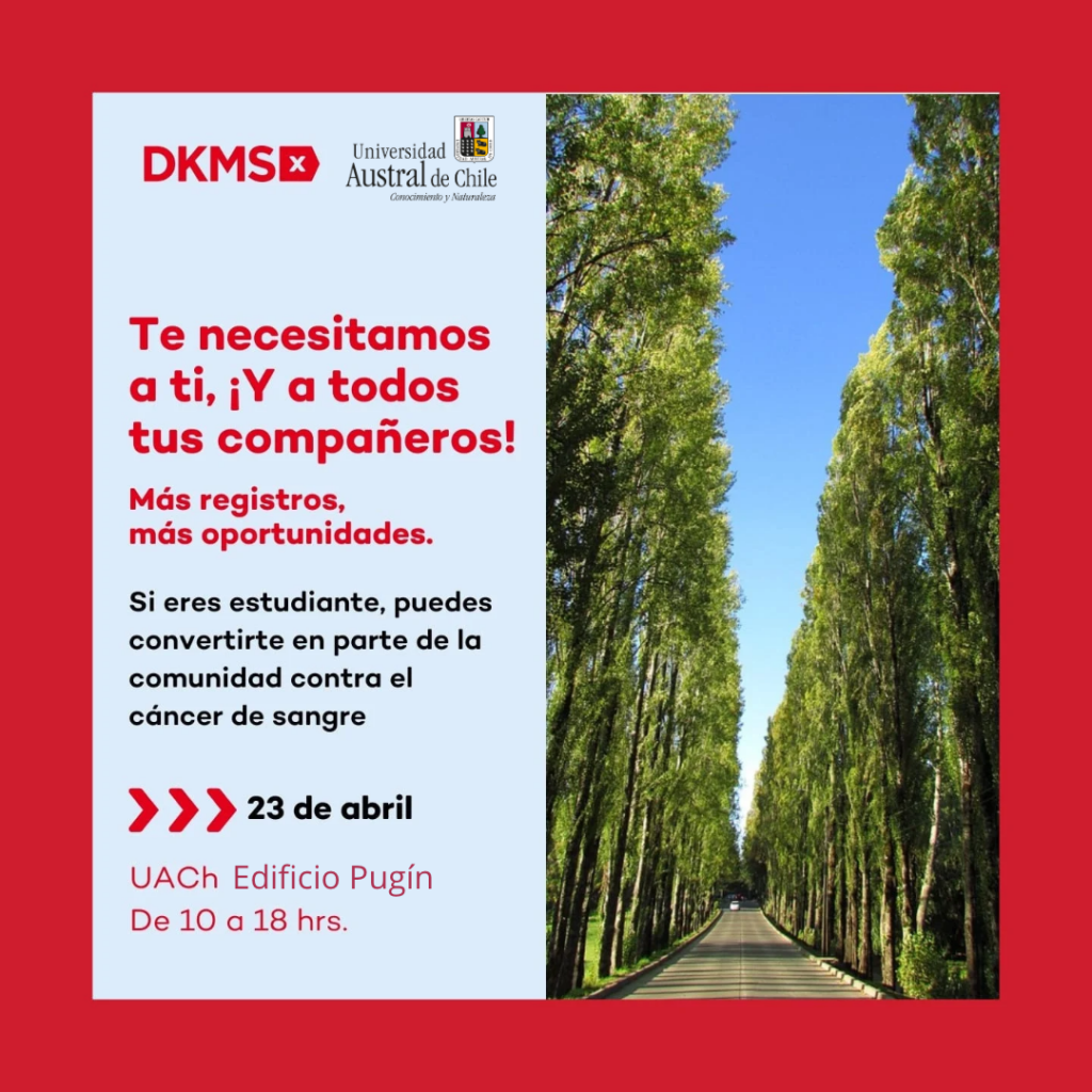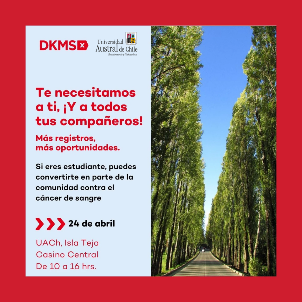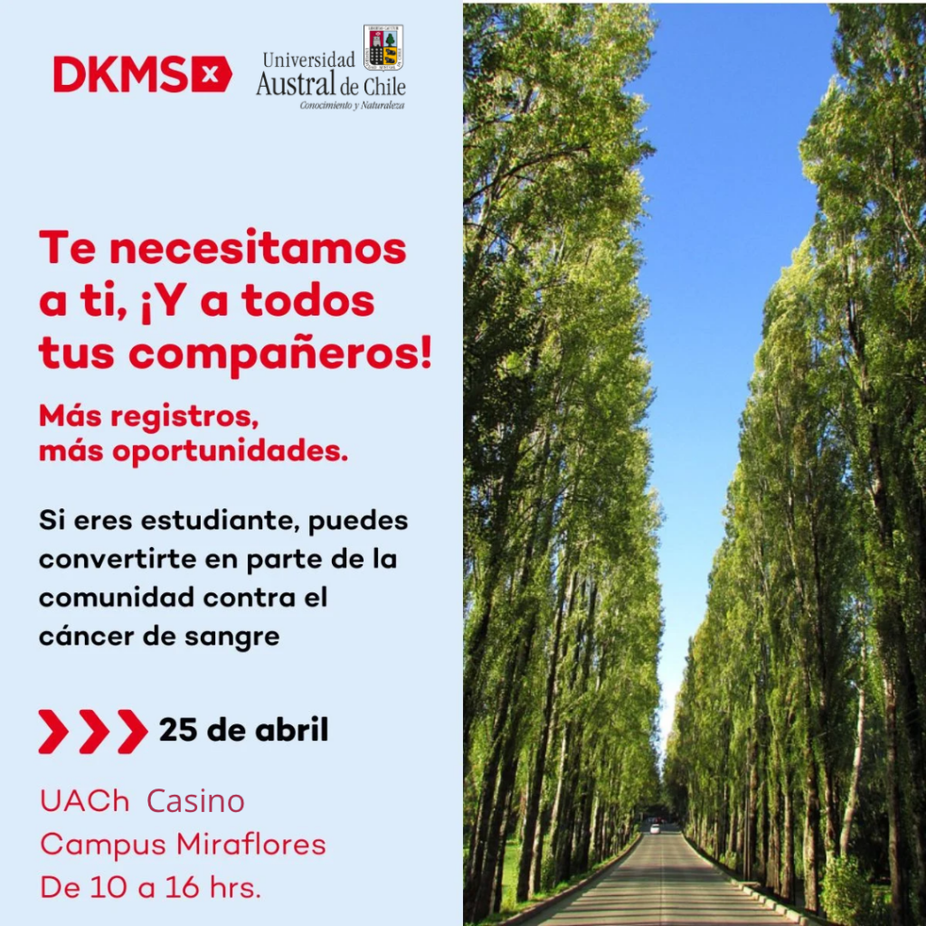 Nuevamente la fundación DKMS y la Universidad Austral de Chile están colaborando en una campaña de captación de posibles donantes de células madres sanguineas. Esta actividad se realizará el 23 de abril en el edificio Emilio Pugín, el 24 de abril en el casino central Isla Teja y por último el 25 de abril en el Casino del Campus Miraflores.
