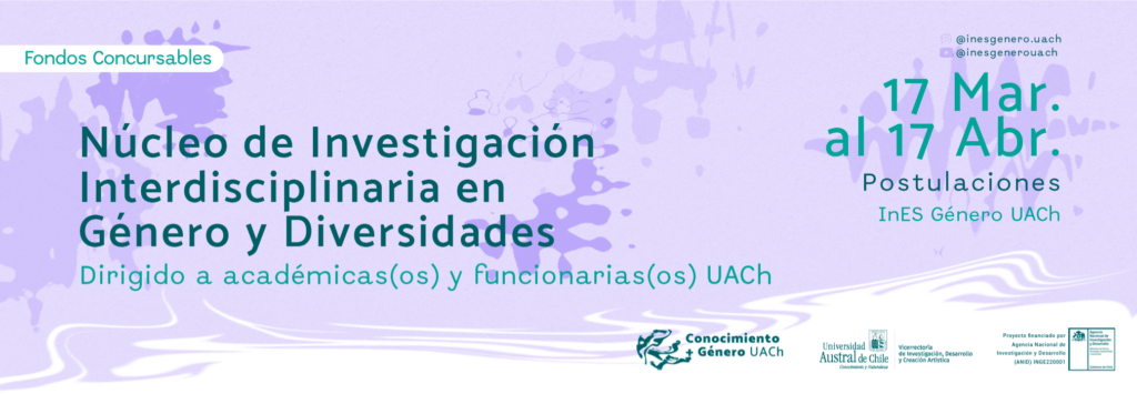 A partir del 17 de marzo y hasta el 17 de abril, académicas(os) y funcionarias(os) de todas las áreas de conocimiento de la UACh podrán postular al Núcleo de Investigación Interdisciplinaria en Género y Diversidades. La convocatoria es realizada por el Proyecto InES Género UACh y la Vicerrectoría de Investigación, Desarrollo y Creación Artística UACh como parte de sus fondos concursables.