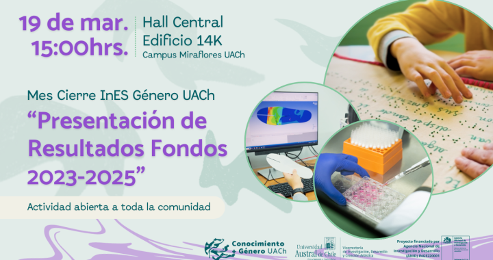 El jueves 19 de marzo, desde las 15:00hrs, se realizará la Presentación de Resultados de Fondos 2023–2025 del Proyecto InES “Conocimiento + Género UACh”. La actividad, abierta a toda la comunidad interesada, se llevará a cabo en el Hall Central del Edificio 14K del Campus Miraflores de la Universidad Austral de Chile.