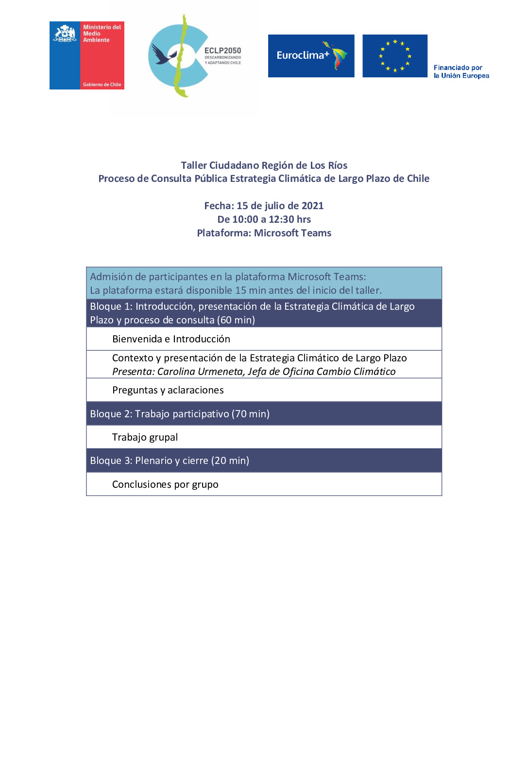 Como parte de este proceso, se realizará un Taller Ciudadano Regional, donde se dará a conocer la propuesta de Estrategia Climática de Largo Plazo, además del desarrollo de una instancia participativa para recoger aspectos relevantes a nivel territorial y recibir aportes desde la visión ciudadana. Este taller se realizará el día 15 de julio de 2021, desde las 10:00 a 12:30 horas, en la plataforma Microsoft Teams. Se adjunta el programa del taller.