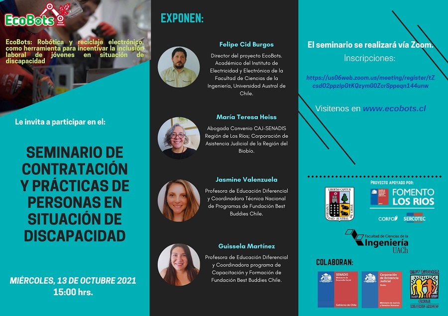 Equipo del proyecto EcoBots de la Facultad de Ciencias de la Ingeniería junto al Comité de Fomento Los Ríos realizarán el “Seminario de contratación y prácticas de personas en situación de discapacidad” que se realizará el próximo 13 de octubre a las 15:00 hrs., a través de la plataforma zoom.
