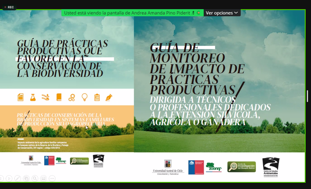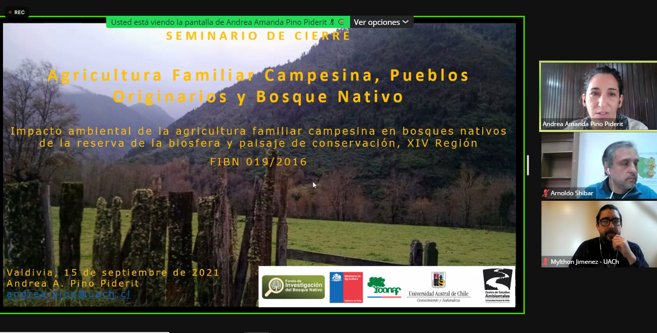 Verónica Oyarzún -quien participó en representación de Carmen Gloria Quezada- presentó el Fondo de Investigación del Bosque Nativo de Conaf. Según dijo, “éste es un proyecto que se enmarca dentro de una línea temática que en ese tiempo -el año 2016- buscaba determinar y evaluar los impactos ambientales de la actividad antrópica en ecosistemas cuyo objetivo es la conservación y preservación. Si ustedes van a nuestro repositorio de información hay varios proyectos que han tratado de caracterizar cuáles son los propietarios y cuál es el tipo de actividad económica que realizan en el bosque nativo, especialmente los pequeños y medianos. Al leer los resultados de otros proyectos se llega a conclusiones similares a las que encontró en su larga investigación Andrea Pino y su equipo”.