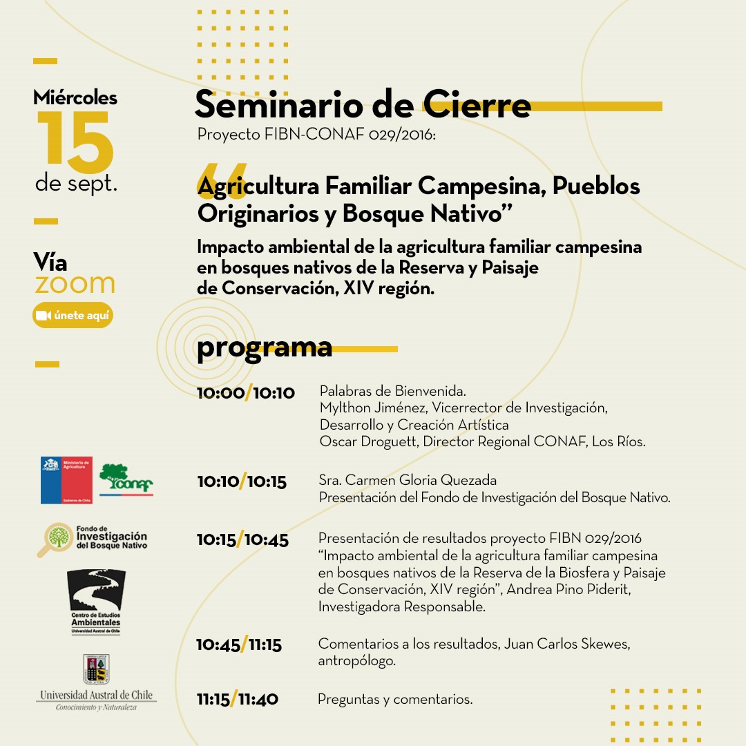 Luego, Carmen Gloria Quezada presentará el Fondo de Investigación del Bosque Nativo, para dar paso a la Directora del CEAM UACh Andrea Pino, quien dará a conocer los resultados del proyecto FIBN 029/2016 “Impacto ambiental de la agricultura familiar campesina en bosques nativos de la Reserva de la Biósfera y Paisaje de Conservación, XIV región”.