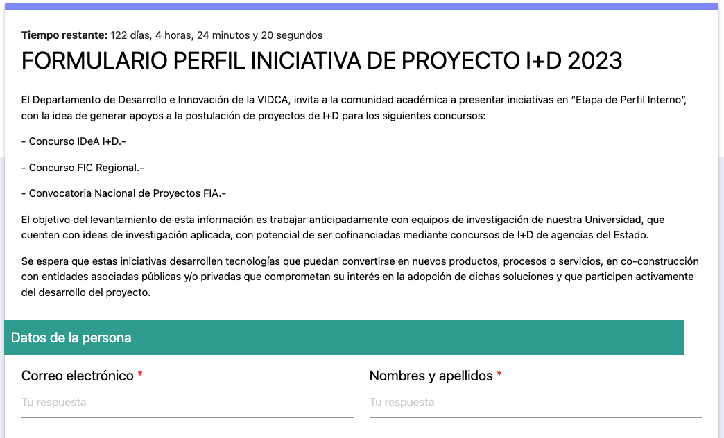 El Departamento de Desarrollo e Innovación de la Vicerrectoría de Investigación, Desarrollo y Creación Artística, invita a la comunidad académica a presentar iniciativas en “Etapa de Perfil Interno”, con el objeto de generar apoyos a la postulación de proyectos de I+D+i para los siguientes concursos: