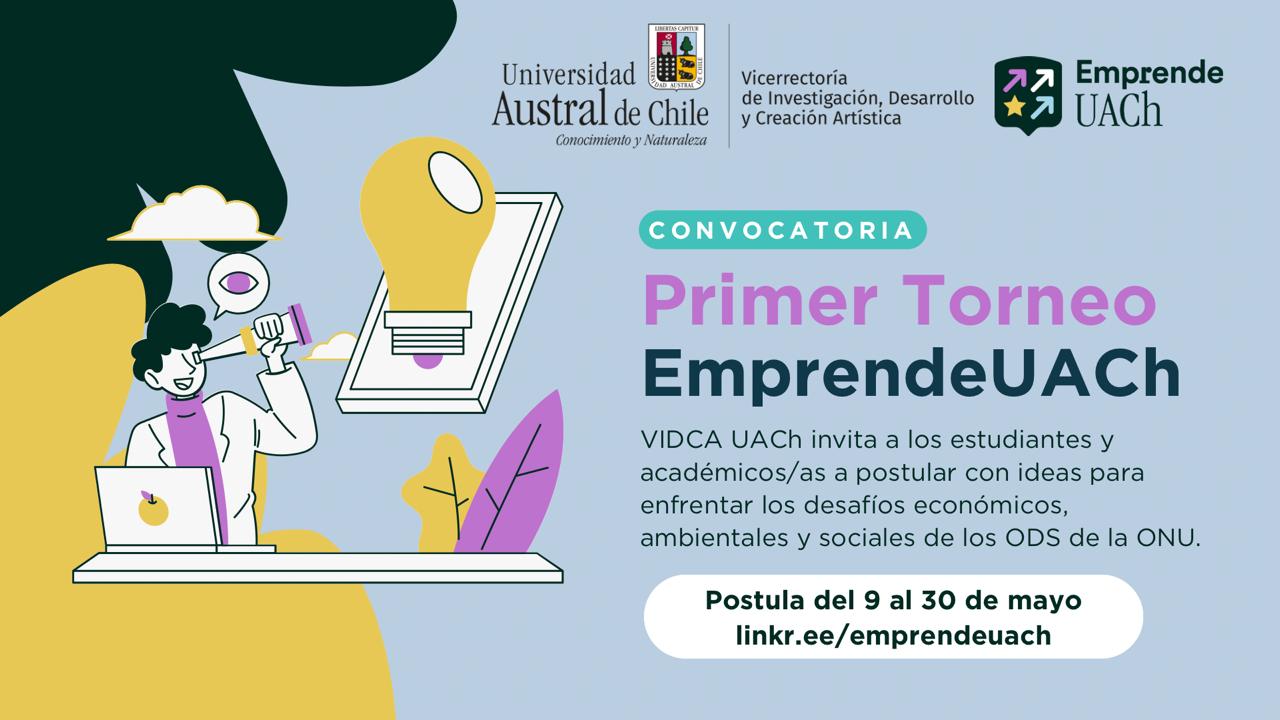 La Universidad Austral de Chile, a través de su Vicerrectoría de Investigación, Desarrollo y Creación Artística VIDCA, en colaboración con la Facultad de Ciencias de la Ingeniería en el contexto de la ejecución de su proyecto InnovING2030, Facultad de Ciencias en el marco de su programa Ci2030, Facultad de Cs. Agrarias y Alimentarias, Centro de Innovación Regional Los Lagos, StartUp Club (UACh), Sede UACh Puerto Montt, Campus Patagonia UACh y Alumni UACh, y la colaboración de los expertos de Grupo Zenit y Oficina de Sustentabilidad UACh, presentan el Primer Torneo EmprendeUACh 2024.