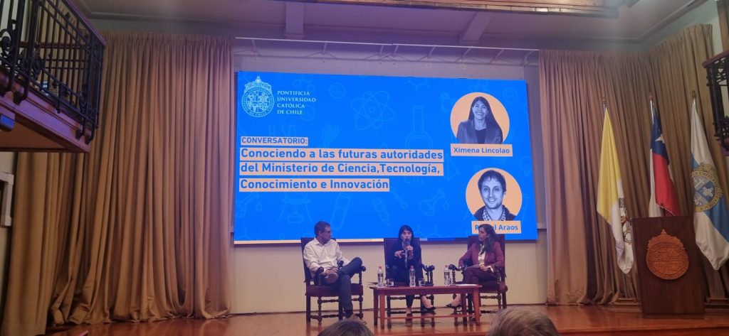 El pasado lunes 9 de marzo en dependencias de la Casa Central Pontificia Universidad Católica de Chile, en Santiago, se realizó el encuentro “Conociendo a Ximena Lincolao, futura ministra de Ciencia, Tecnología, Conocimiento e Innovación. Esta actividad tuvo como objetivo generar un espacio de conversación entre la Dra. Lincolao, el subsecretario Rafael Araos y la comunidad académica.