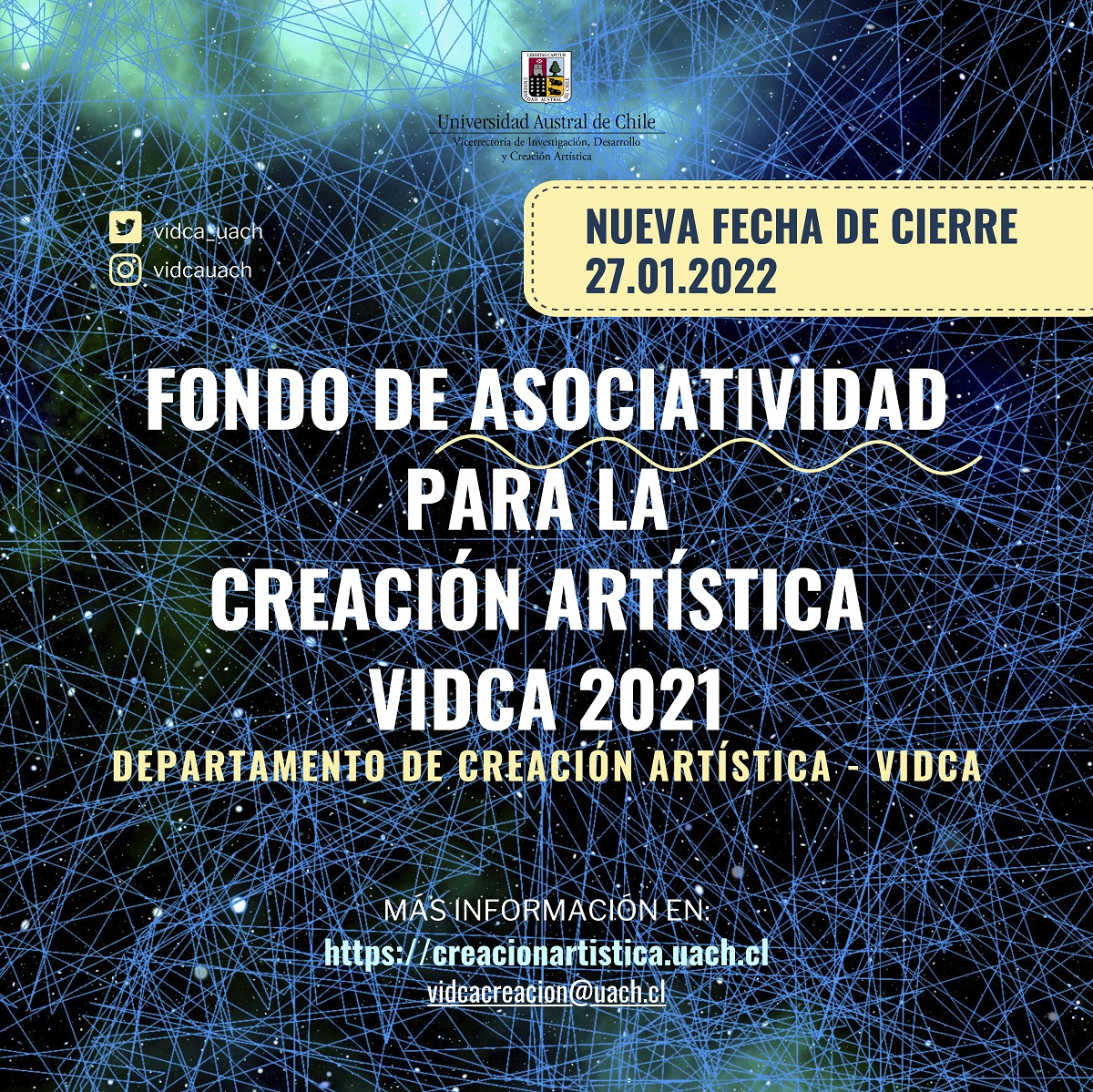 El Departamento de Creación Artística de la Vicerrectoría de Investigación, Desarrollo y Creación Artística (VIDCA) de la Universidad Austral de Chile informa que se extiende el plazo de postulación al Fondo de Asociatividad para la Creación Artística.