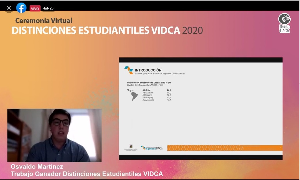 Osvaldo Martínez Burgos, estudiante de la Escuela de Ingeniería Industrial, Licenciado en Ciencias de la Ingeniería. Postuló a este concurso con su tesis “Método de estimación de la condición estructural del pavimento a partir de su condición funcional utilizando algoritmos de Machine Learning”.