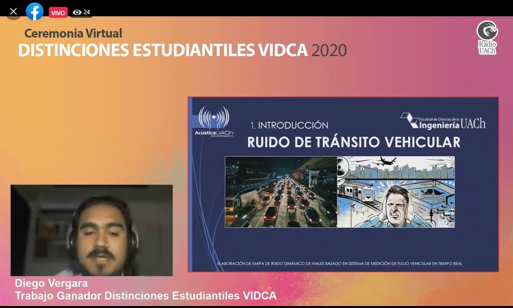 Diego Vergara Elgueda, titulado de Ingeniería Civil Acústica, postuló a este premio con su tesis “Elaboración de mapa de ruido dinámico de viales basado en sistema de medición de flujo vehicular en tiempo real”, desarrollada durante el año 2019, en el contexto del proyecto de investigación FONDECYT Regular 1180547 “Development of low-cost models for urban noise assessment”. Fue defendida en diciembre de 2019 y continúa en desarrollo como tesis de Magíster en Acústica y Vibraciones de la UACh.