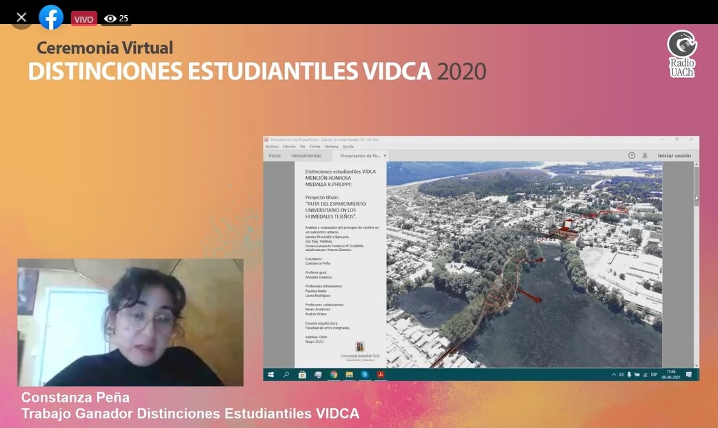 La estudiante postuló con su proyecto de diseño urbano contenido en su tesis de pregrado: “Ruta del esparcimiento universitario en los Humedales Tejeños”. Análisis y evaluación del principio de confort en un subcentro urbano, barrios Prochelle y Bancario, Isla Teja Valdivia”.