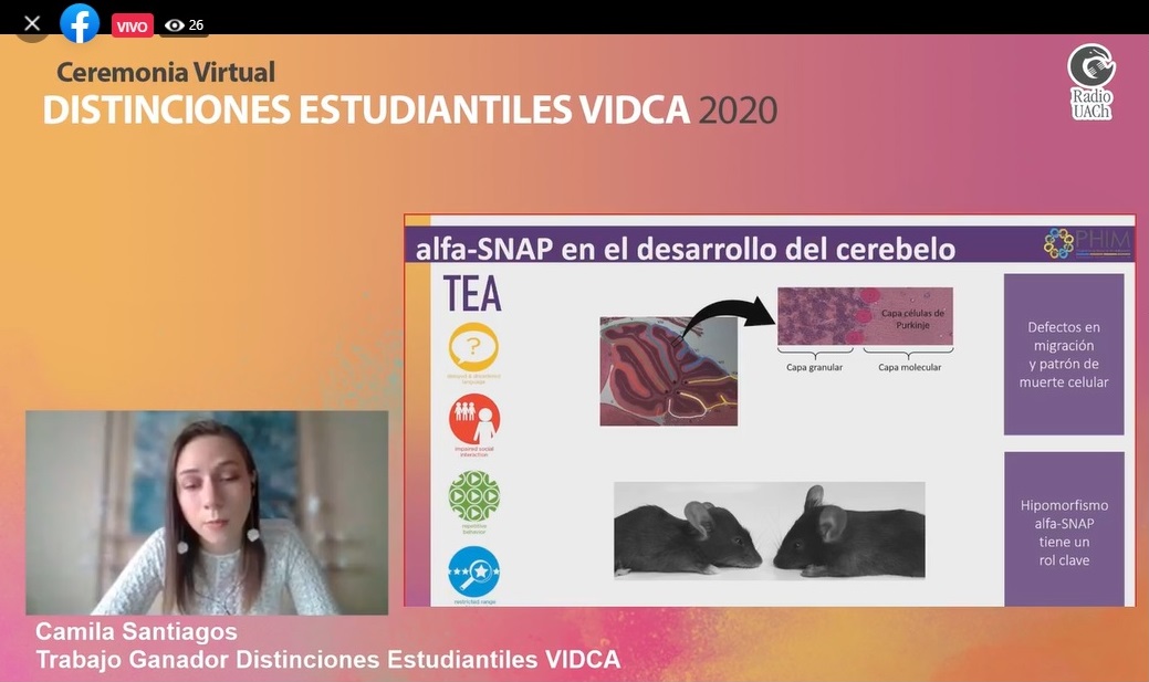 La joven investigadora explicó el contexto de su conferencia: “Participación de alfa-SNAP en el proceso de desarrollo del cerebelo y neurogénesis de las células de Purkinje”, trabajo presentado en enero de 2020 en “ReBrain International Conference: advances in the study of the central nervous system”; con la cual postuló a esta distinción.